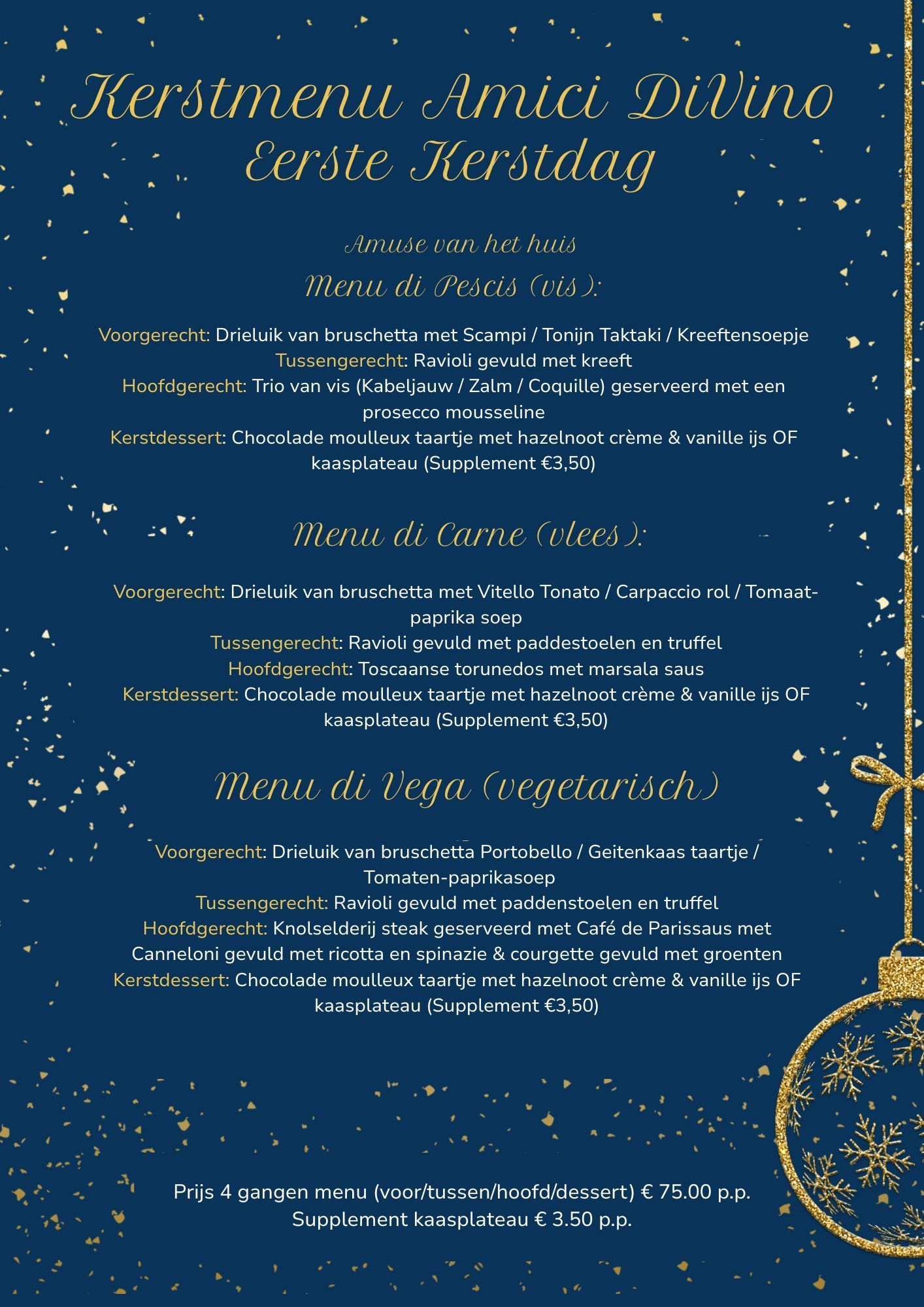 Beleef de kerstdagen in Italiaanse sferen bij Amici DiVino in Meerssen. Wij serveren tijdens de feestdagen verfijnde menu’s.